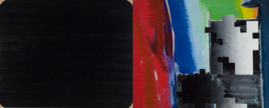 Les empâtements rugueux de la palette funèbre et les dégradés de Tours jumelles, nous rappels le scénario complet des images qui ont noirci nos mémoires collectives en direct en gros plan puis ad nauseam en différé. Dans d’autres tableaux, les noirs sont appliqués avec le doigt directement du pot, avec le pinceau en glacis transparents ou opaques ou en traînées à l’aide de l’éponge pour multiplier les effets de matière. Comme dans les sphères, le noir est aussi une couleur et additionné de bleue phtalo, le perce de trous luisants comme dans le tableau qui donne le titre à l’exposition. Ces procédés picturaux traduisant toutefois une volonté d’aller au-delà d’une simple affirmation « radicale » de l’objet.
